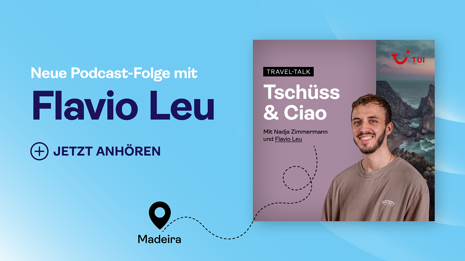 Abenteuer im Wanderparadies Madeira mit Flavio Leu: In der neuesten Folge des TUI Reisepodcasts „Tschüss & Ciao“ begrüsst Moderatorin Nadja Zimmermann den weitgereisten Influencer und Alltagsphilosophen Flavio Leu. Flavio nimmt uns mit auf eine Reise durch das Wanderparadies Madeira, eine Insel, die für ihre atemberaubende Natur und einzigartigen Erlebnisse bekannt ist.