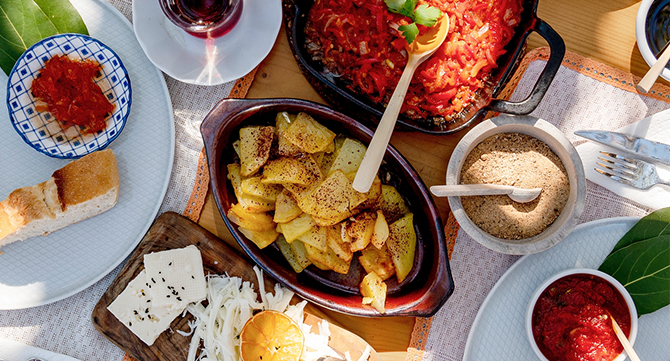 Unsere Reise endet dort, wo sie begonnen hat – in einem Restaurant. Im «Paşa Kır Bahçesi» sitzt man in kleinen Holzhütten im Schneidersitz an tiefen Tischen und schlemmt sich durch die grosse Auswahl an Frühstücksspezialitäten, die hier den ganzen Tag serviert werden. So probiert man das süsse Tahin Pekmez, eine Art Sesammus, das im ganzen Land als Brotaufstrich gereicht wird. Man bekommt eingelegte Walnüsse gereicht genauso wie das würzige Menemen, eine traditionelle Eierspeise mit Tomaten und Paprika. Und wie zu Beginn dieser Geschichte hört es auch hier nicht auf. Schale folgt auf Schale, bis der Tisch voll ist und der Schmaus beginnen kann.