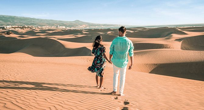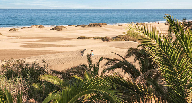 Die atemberaubende Dünenlandschaft von Maspalomas erstreckt sich über rund sechs Kilometer. Ein breiter, abgesteckter Pfad führt durch die Dünen und lädt zu romantischen, philosophischen oder erholsamen Spaziergängen ein.