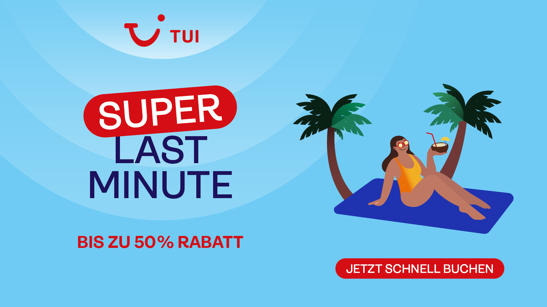 Hier findest du jetzt stark reduzierte Angebote in den schönsten Ferienorten von Mallorca, der Türkei, den Kanarischen Inseln, Griechenland, und viele mehr. Lass dich von unseren Tipps begeistern und träume schon jetzt von unvergesslichen Momenten mit deinen Liebsten. Egal ob Trauminsel, romantische Ferien zu zweit oder lang ersehnte Familienferien, mit dem Super Last Minute Sale von TUI sparst du auf ausgewählte Reisen inklusive Flug, Hotel und Anreise.