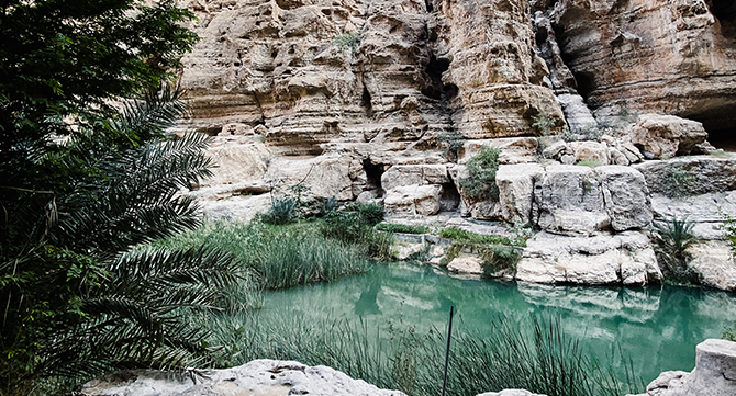 An unserem ersten Tag sind wir mit dem Auto Richtung Süden zu Wadi Shab gefahren. Die Wadis im Oman sind Flussbetten inmitten der Wüste und somit eine geologische Besonderheit. Führen sie Wasser, dann verwandeln sich die kargen Trockentäler in eine blühende Oase mit paradiesischem Flair. Die Wadis gehören somit zu den beliebtesten Sehenswürdigkeiten im Oman. Nach einer ca. 45 Minuten Wanderung sind wir in der Oase angekommen und haben nicht schlecht gestaunt.