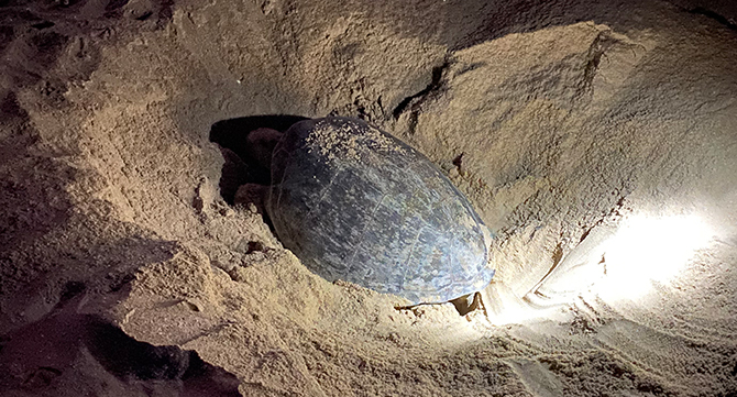 Unser Weg führte uns an Tag 2 nach Ras Al Jinz zum Turtle Reserve. Der Strand von Ras al Jinz ist der Brutplatz von vielen Meeresschildkröten. Das Turtle Reserve bietet die einmalige Gelegenheit Wasserschildkröten in der Nacht bei der Eiablage oder am Morgen beim Schlüpfen der Jungen zu beobachten. Wir entschieden uns für die Tour am Abend und durften eine Schildkröte nach der anderen bei der Eiablage spotten.