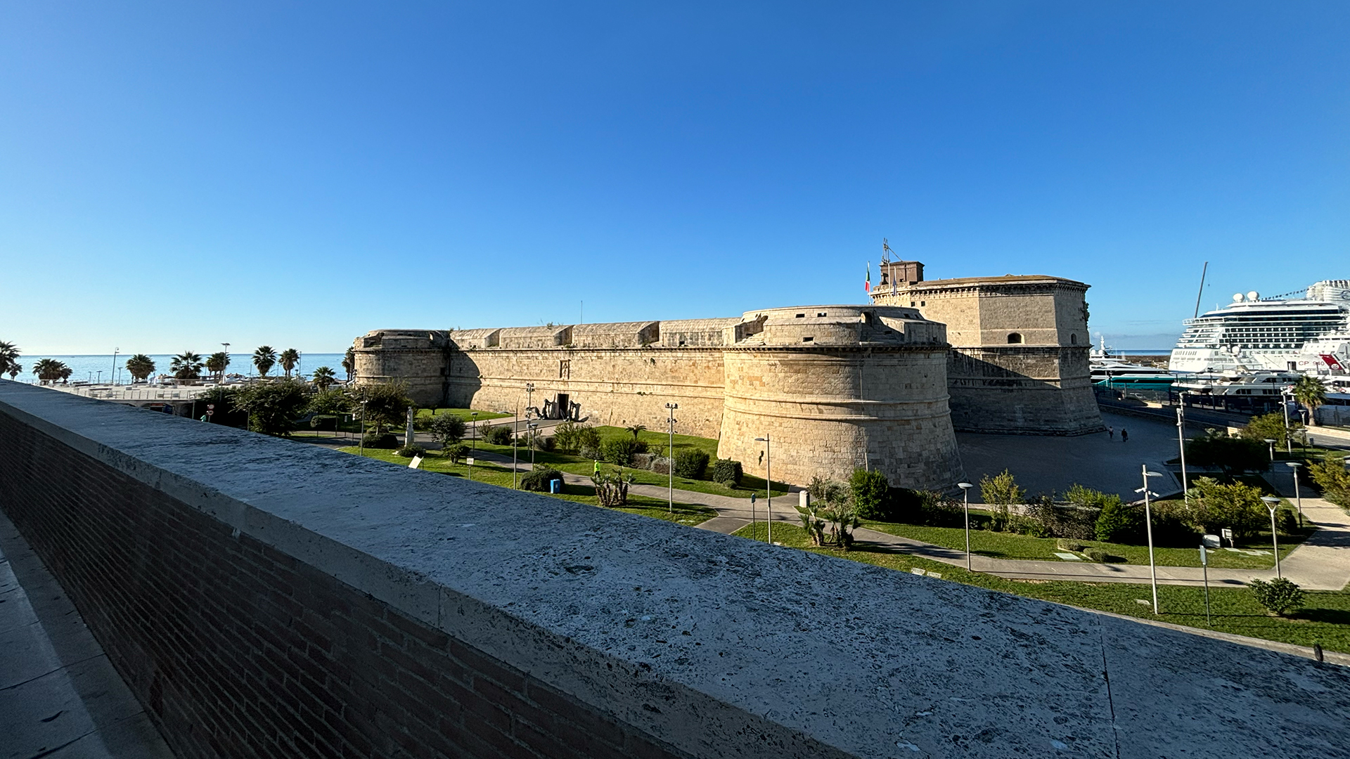 Besonders schön sind jeweils die Sonnenauf- und -untergänge, wie auch der ganze Nachthimmel inklusive strahlendem Vollmond. Für den Stadtrundgang in Civitavecchia stehen wir früh morgens auf. Es ist noch nicht viel los, aber genau das macht es so schön. Es hat viele kleine Gässchen in der Stadt. Später machen wir noch einen Spaziergang an der Strandpromenade. Die Michelangelo Festung ist sehr imposant. Gegen Mittag gehen dann auch die Läden auf. Den Nachmittag geniessen wir auf Deck 16 an der strahlenden Sonne und lesen ein Buch. Das Deck 16 hat einen schönen Pool und diverse Whirlpools. Einziger Nachteil: es gibt oft Unterhaltung und Animation, sodass es etwas lauter ist dort.